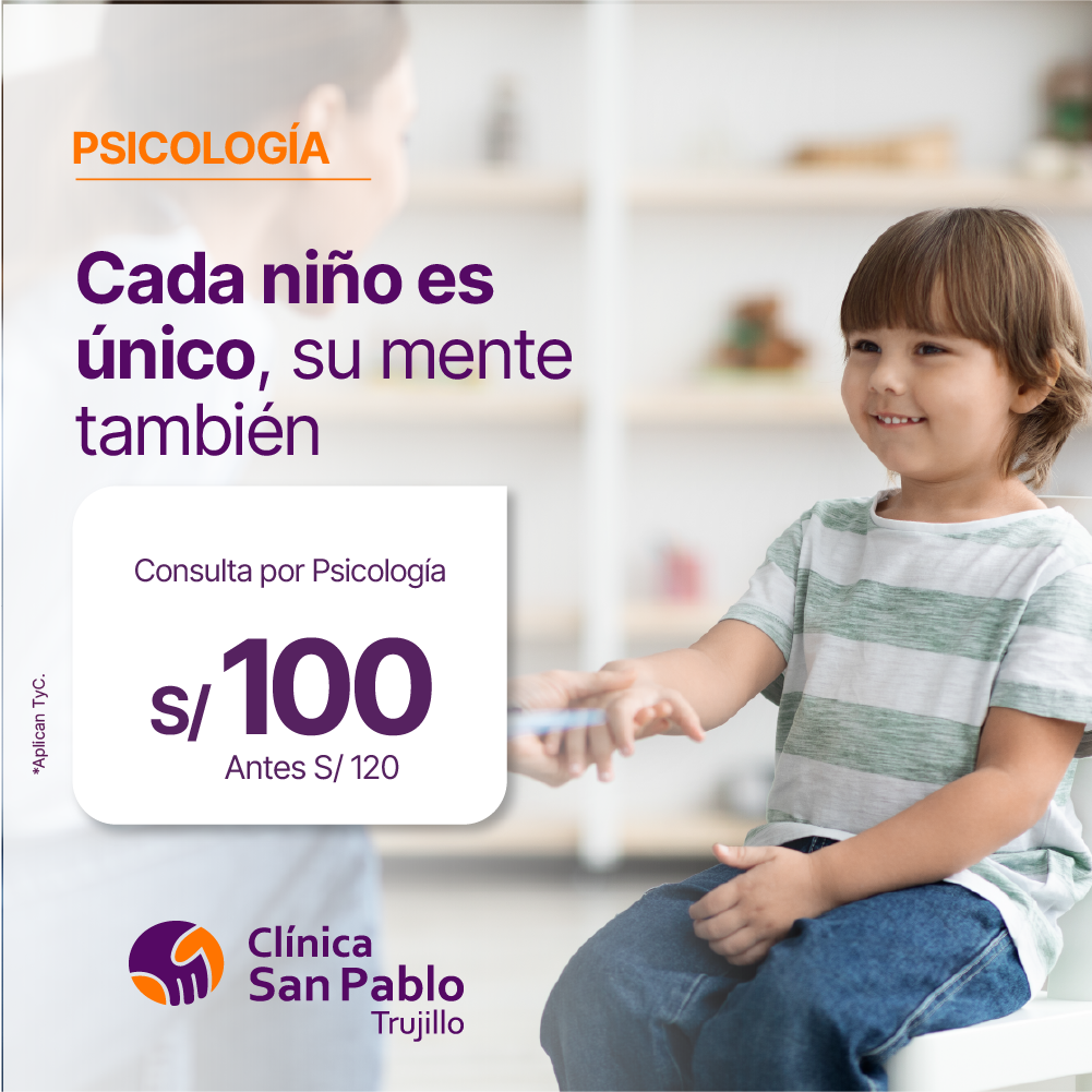 • Incluye consulta psicológica + orientación gratuita en caso requiera atención médica el niño o adolescente.